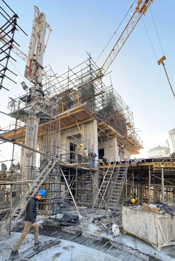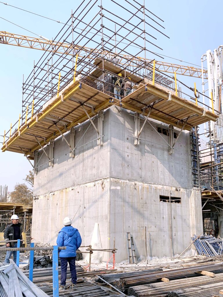 • اجرای همزمان هسته و سقف: با پیشتاز بودن هسته، عملیات سقف (شامل قالب‌بندی با میز پرنده، آرماتوربندی، عملیات پیش‌‌تنیدگی و بتن‌ریزی) بدون توقف پیش می‌رود و زمان اجرای سقف به ۱۱ تا ۱۶ روز کاهش می‌یابد و کل سیکل هر طبقه به ۱۵ تا ۲۰ روز می‌رسد.